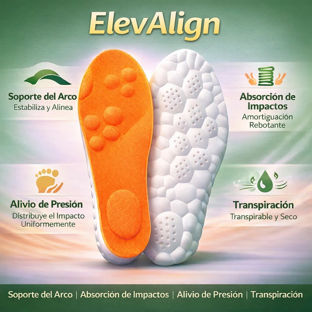 ElevAlign. Su diseño único ofrece soporte dirigido al arco, distribuyendo la presión de manera uniforme y reduciendo la tensión en la fascia plantar.